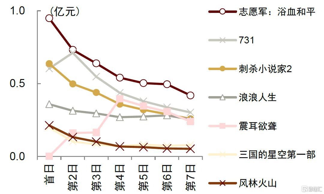 图表:2025年国庆档主要影片单日票房走势:《志愿军:浴血和平》占据较高市场份额