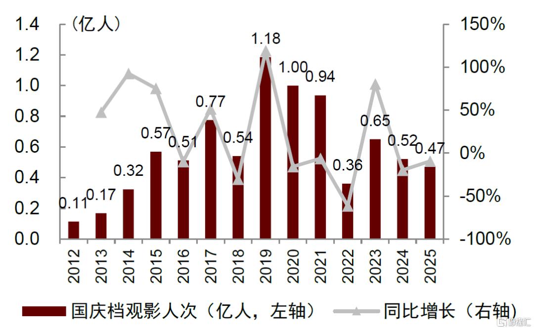 图表:2025年国庆档观影人次0.47亿人,同比下降9.6%