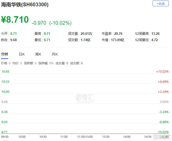 海南华铁今日一字板跌停,报8.71元创今年4月中旬以来新低,总市值173.89亿元。