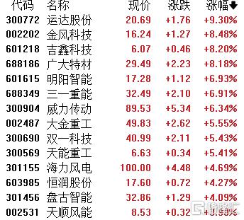 风电设备走高,运达股份涨超9%,金风科技、吉鑫科技、广大特材、明阳智能、三一重能、威力传动、大金重工、双一科技等跟涨。