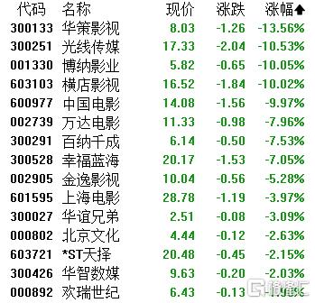 影视院线板块领跌,华策影视跌超13%,光线传媒、博纳影业、横店影视、中国电影、万达电影等跟跌。