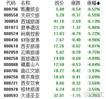 旅游及酒店板块下挫,凯撒旅业跌超8%,天府文旅、西域旅游、君亭酒店、岭南控股、西安旅游、云南旅游、首旅酒店等跟跌。