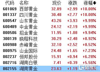 贵金属、黄金概念走高,西部黄金、四川黄金、山东黄金、中金黄金等涨停,赤峰黄金、山金国际等跟涨。