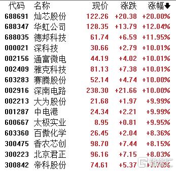 存储芯片、半导体板块上涨,灿芯股份20CM涨停,华虹公司、深科技、通富微电、雅克科技、赛腾股份、深南电路、大为股份等跟涨。