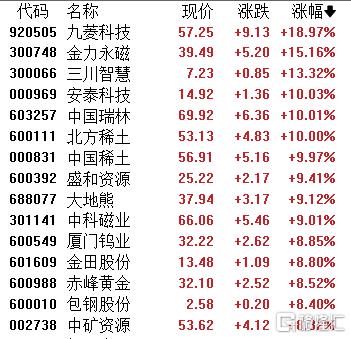 稀土永磁板块活跃,金力永磁涨超15%,北方稀土、中国稀土涨停,盛和资源、三川智慧、安泰科技、中国瑞林等跟涨。