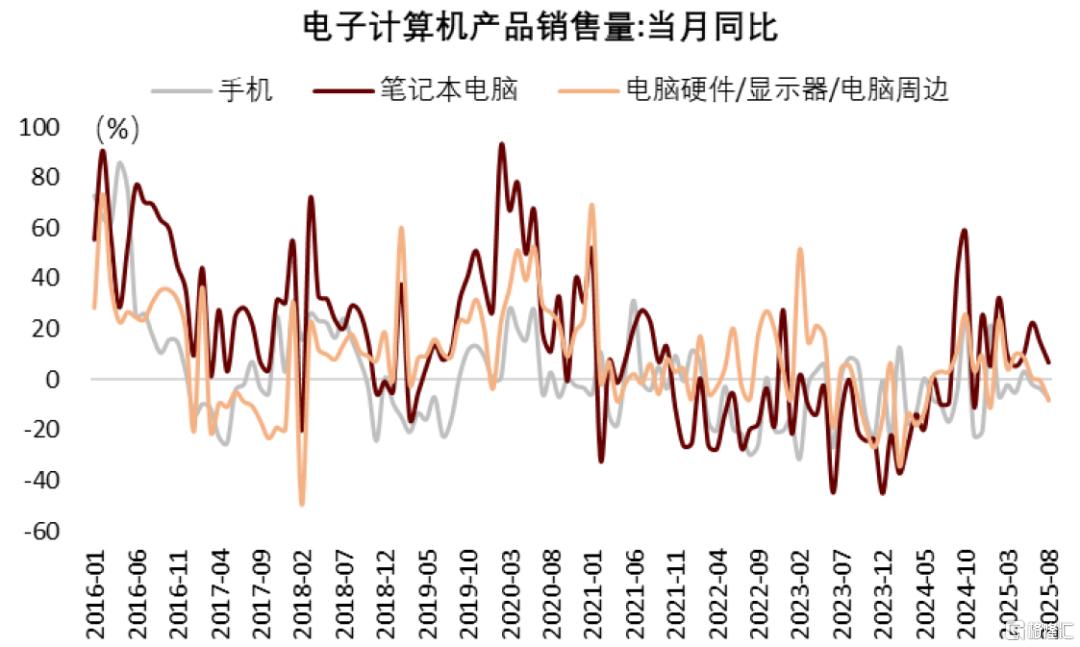 手机销售增速继续走低,半导体销量维持高增。终端需求方面,8月手机销量同比下降7.4%,降幅边际扩大,笔记本电脑同比增长6.8%、电脑硬件/显示器/电脑周边同比下降8.1%。半导体行业景气度仍然较高,7月全球半导体销售额同比增长20.6%,中国半导体销售额同比增长10.4%。人工智能的商业化应用推广,叠加国产替代紧迫性增加,我们认为未来半导体设备投资、材料国产化率有望持续提升。Meta召开2H25秋季新品发布会,重点发布三款AI眼镜,包括Ray-Ban Meta二代、Oakley Meta Vanguard以及Meta Ray-Ban Display(含配套EMG手环)。由于AI计算对高性能内存产生较大需求,9月闪迪、美光均宣布存储产品提价,央视财经提出“全球存储芯片掀起涨价潮,人工智能热潮下,存储芯片行业或迎来超级周期”,存储芯片涨价和扩产受到关注。