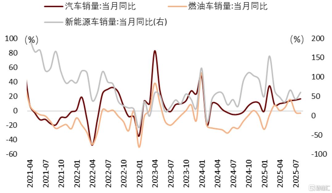 汽车销售维持高增长,新能源汽车热度延续。根据中汽协,8月汽车销量285万辆,同比上升16%,新能源汽车销量140万辆,同比增长27%,国内新能源渗透率达到49%。政策加码汽车消费补贴,以旧换新政策申请支撑低端车及商用车需求。9月12日工信部等八部门发布《汽车行业稳增长工作方案(2025~2026年)》,提出通过消费贷款贴息、优化限购等措施刺激需求。9月进入“金九银十”传统旺季,我们认为短期汽车销售增长有望延续。往后看,2025年是新能源汽车购置税免征政策实施的最后一年,随着国内汽车消费空间增长放缓,汽车行业发展路径一方面是持续由电动化到智能化转型,另一方面车企积极出海拓宽新市场需求。