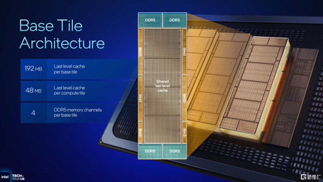 至于三个Active Base Tile,则采用Intel 3工艺制造,每个Base Tile搭载四个 DDR5 内存控制器,芯片上总共有 12 个内存通道。值得一提的是,该模块还包含一个共享 LLC,每个Compute Tile 48 MB,每个Base Tile192 MB,这就使得能提供高达 576 MB 的封装内 LLC 容量。这些 Tile使用 EMIB 连接到其上方的计算模块 (Compute Tile)。
