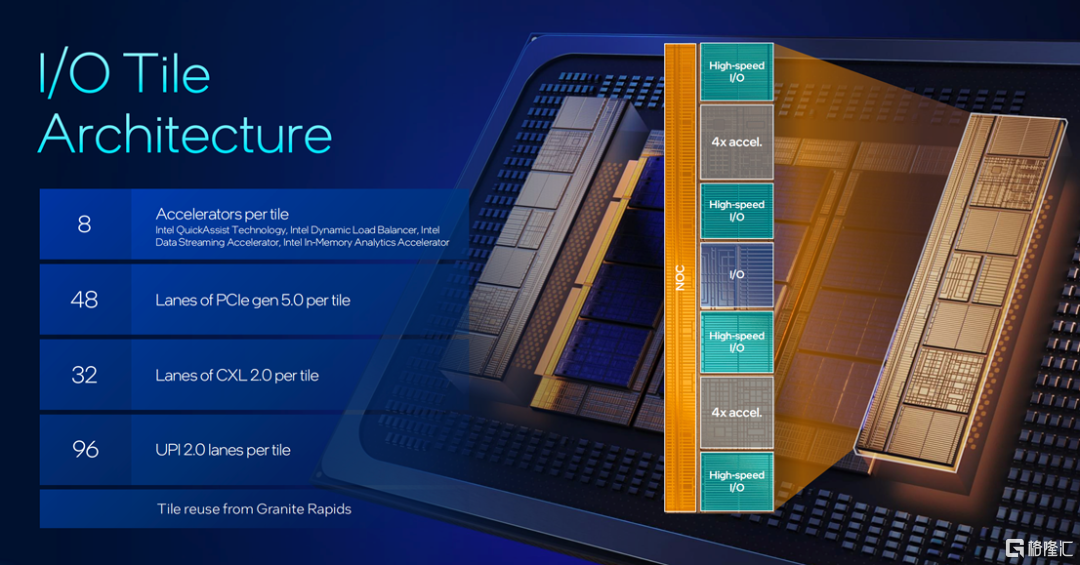 再看I/O Tile,据介绍,Clearwater Forest的每个 I/O Tile 提供 48 条 PCIe Gen 5.0 通道(共计 96 条)、32 条 CXL 2.0 通道(共计 64 条)和 96 条 UPI 2.0 通道(共计 192 条)。