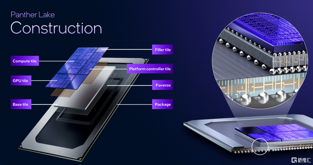 作为英特尔首款Intel 18A AI PC处理器,Panther Lake无疑是一颗性能与能效兼备的芯片。从配置上看,如图所示,英特尔的“Panther Lake”主要由五个tiles组成,分别是计算Tile、GPU Tile、Base Tile、Filler Tile和平台控制Tile。然后,再利用英特尔领先的Foveros 2.5D封装技术,把这些Tiles集成到一起,打造起一个极具竞争力的SoC。