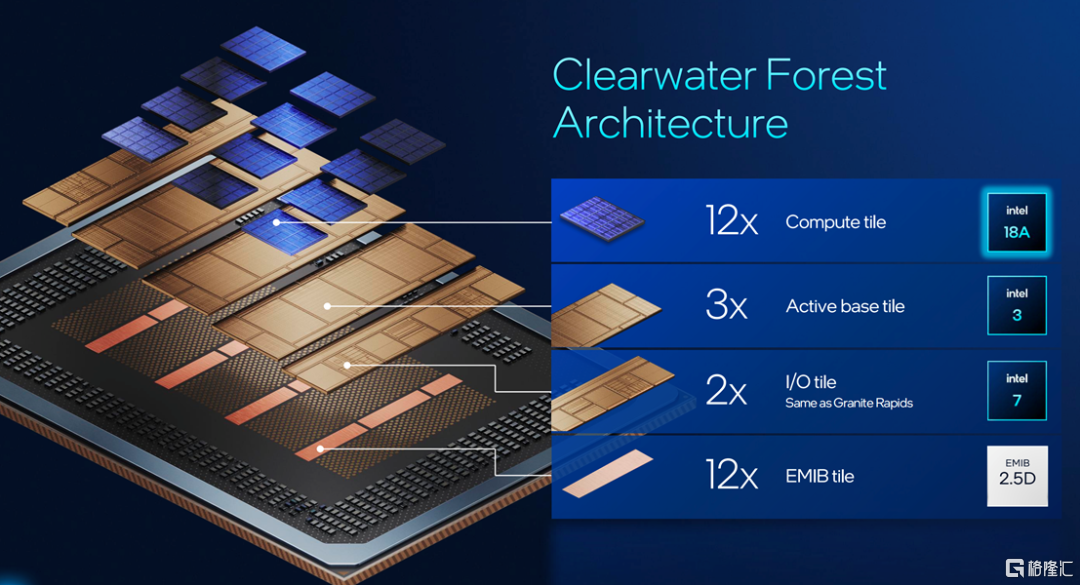从设计上看,英特尔介绍说,一颗 Clearwater Forest由 12 个采用 2.5D 封装的 EMIB tiles组成,这些tiles将三个active base tiles连接在一起,然后连接到两个 I/O tiles和总共 12 个计算tiles。其中I/O 模块采用intel 7 工艺打造,active base tiles采用intel 3 工艺打造,计算芯片组则采用intel 18A 工艺节点制造。