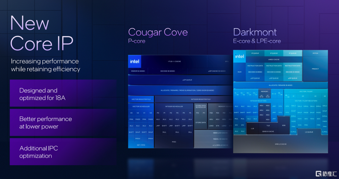 首先在Compute Tile方面,据介绍,这个Tile内部含有P 核(Cougar Cove)和 E 核(Darkmont)、NPU 5、IPU(Image Processing Unit ) 7.5 、内存接口以及和图形块分离的 Xe 媒体和显示引擎。当中,基于X86架构的Cougar Cove和Darkmont无疑是英特尔处理器的重中之重,这其实也是英特尔处理器的安身立命之本。