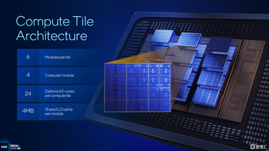 首先看计算tiles,如图所示,每个计算tiles,由 6 个模块组成,每个模块包含 4 个 Darkmont E-Core。这样,每个计算tiles就有 24 个 Darkmont E-Core,12 个计算tiles上共有 288 个 E-Core。每个模块还包含 4 MB 的 L2 缓存,这意味着每个计算块拥有 24 MB 的 L2 缓存,12 个计算块总共拥有 288 MB 的 L2 缓存,这就让整个芯片的 L3+L2 缓存总计高达 864 MB。