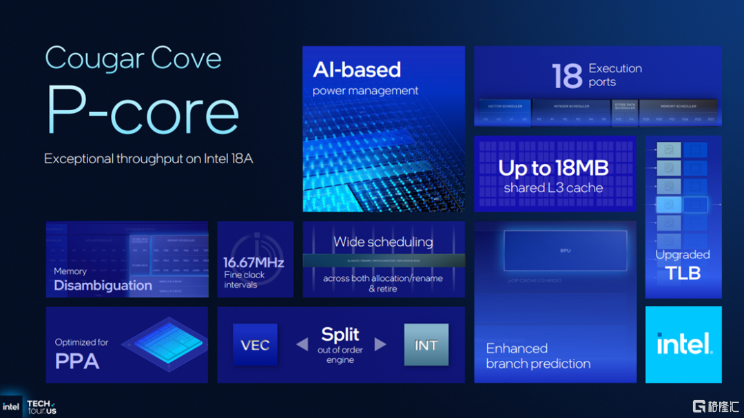在 P 核(Cougar Cove),按照英特尔所示,新内核的改进主要是对现有 CPU 架构的典型改进,例如改进的分支预测器和容量更大的转换后备缓冲区 (TLB)。正如英特尔方面所说:“我们没有改变宽度,也没有改变深度,我们进行了优化。”英特尔同时强调:“Cougar Cove 现在采用了一种基于人工智能的电源管理方法,可以根据不同工作负载的需求动态调整某些功能单元(如预取器)的积极性。”