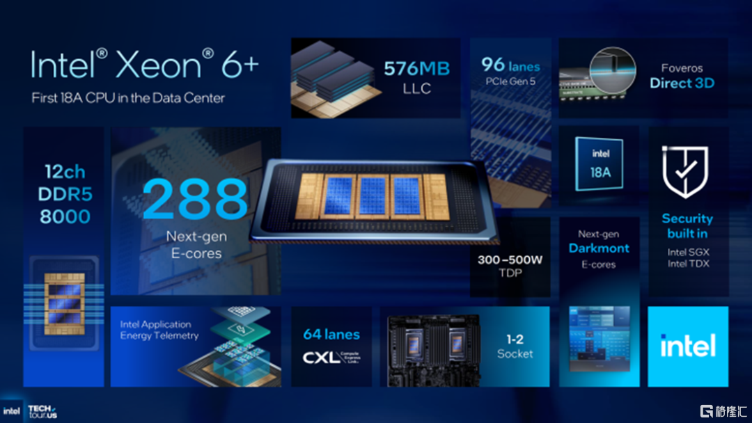 据称,Clearwater Forest 与当前的 Xeon 69xxE/P 平台兼容,允许重复使用现有服务器,同时保留 12 个内存通道以及广泛的 PCIe 和 CXL 支持。而随着内存速度正朝着 DDR5-8000 迈进,英特尔还公布了一个系统规格,例如每个插槽最多 288 个核心,双插槽上限接近 576 个核心,以及整个封装中超过 1,152 MB 的组合末级缓存。