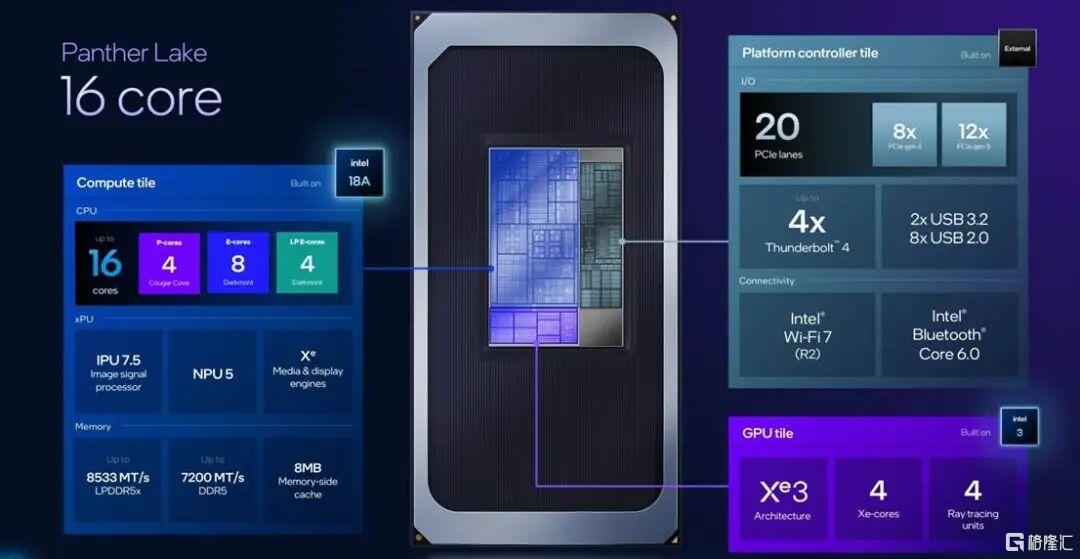 Panther Lake融合了Lunar Lake的高能效和Arrow Lake的高性能。二者优势合一,让Panther Lake成为一个兼具出色能效、卓越性能和强大扩展性的产品系列。