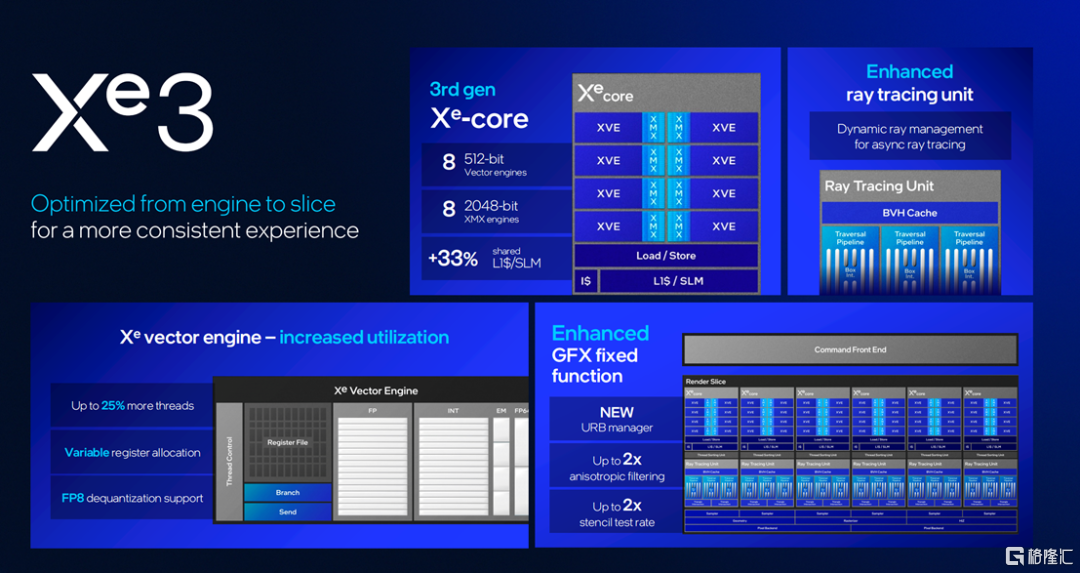 英特尔介绍说,Xe3 GPU 经过重新设计,以提高可扩展性。在 GPU 的渲染切片中,英特尔将 Xe 核心数量从 4 个增加到 6 个,一级缓存从 192 KB 增加到 256 KB,二级缓存从 8 MB 升级到 16MB,从而减少了访问本地内存的需求并提升了性能。英特尔同时指出,Xe3 GPU 的分配线程中还采用了可变分配策略,这对性能产生了显著的影响。