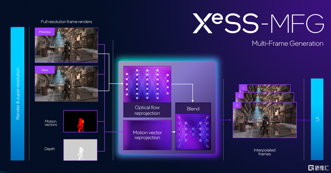 Panther Lake的发布,英特尔推出了 XeSS-MFG(XeSS Multiframe Generation)功能,它可以与现有的升级和多帧生成技术相结合,最多注入三个额外的插值帧。按照英特尔介绍说,在实际应用中,你可以将其作为英特尔现有英特尔图形软件包的一部分进行控制,也可以选择设置额外的帧,或者让应用程序自行决定。