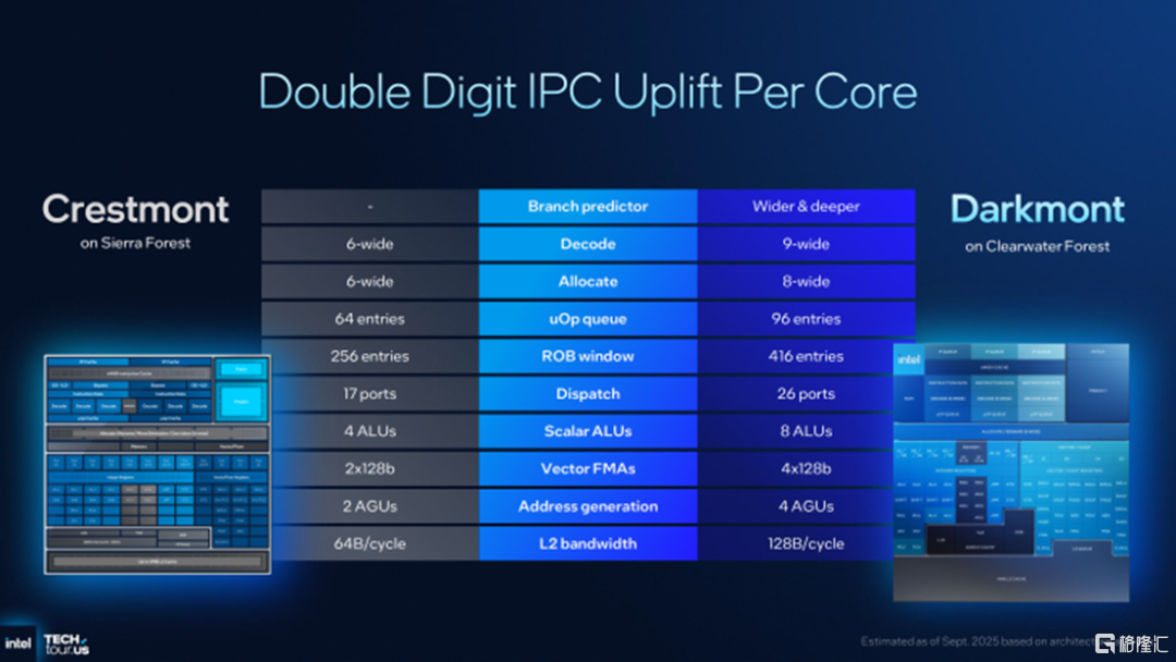 据介绍,该内核主要依赖于更宽、更并行的前端和增强的乱序执行引擎;同时,Darkmont的每个核心配备64 KB指令缓存,并扩展了解码器,使其每个周期能够处理比之前一代的Crestmont E-core更多的指令;至于其重新排序和分配结构,也得到了改进;此外,分配单元有所增加、乱序窗口也得到了扩大,以容纳更多正在进行的工作;再者,执行资源也成倍增加,用于整数和矢量运算的执行端口也大幅增加,这使得核心能够维持更高的并行吞吐量。