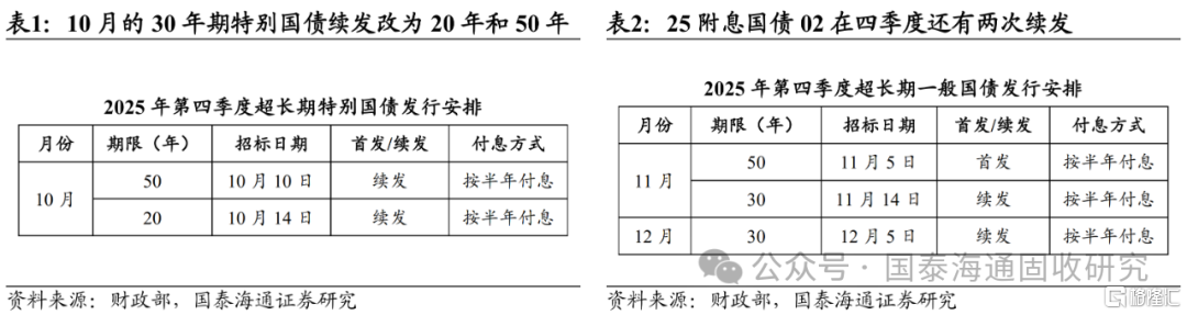 一、四季度国债发行计划公布,30年切券逻辑可能变化:9月30日,财政部公布2025年第四季度国债发行计划。对比4月份公布的2025年一般国债、超长期特别国债发行有关安排,此次最大的变化是将10月的30年期特别国债续发改为20年和50年期的特别国债续发。30年期特别国债不再续发意味着25特国06存续规模止步在2470亿。后续25特国06活跃度持续提升的切券行情可能被打断,25特国06和25特国02活跃度接近的情况可能会持续到11月中下旬。