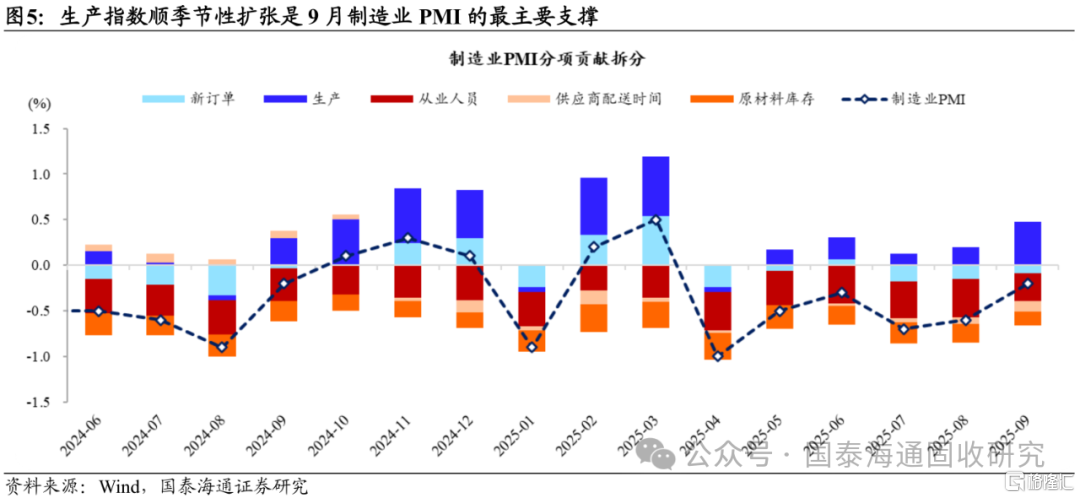 供需对比来看,生产扩张依然快于需求。9月生产指数和新订单指数均边际回升,分别录得51.9%和49.7%,较8月提高1.1和0.2个百分点。生产指数扩张态势延续,已经连续5个月运行在扩张区间,天气扰动消退后9月生产端扩张进一步提速;相比之下,虽然9月新订单指数边际有所好转,但新出口订单指数的修复程度更大(环比提升0.6个百分点),即外需拖累减弱反而成为需求端的边际支撑,内需依然有待提振。