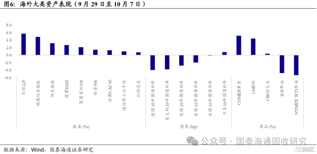 三、海外资产涨跌:股票>债市>商品。国庆假期前后(9月29日-10月7日)的大类资产表现:股票>债市>商品。(1)海外主要股指均上涨:亚洲市场表现亮眼,日经225上涨5.7%、韩国综合指数上涨4.8%、恒生指数上涨3.2%;美国三大股指均上涨,标普500、纳指和道琼斯工业指数分别上涨1.5%、0.8%和1.0%;欧洲市场中,德国DAX上涨2.7%、英国富时100上涨2.1%、法国CAC40上涨1.3%。(2)全球债市多数上涨:10Y美债收益率下行2.0bp至4.18%,10Y英国国债收益率下行2.8bp至4.71%,10Y德国国债收益率下行4.0bp至2.72%,10Y法国国债收益率下行0.1bp至3.57%,10Y意大利国债收益率下行3.8bp至3.57%,10Y日本国债上行0.8bp至1.68%。(3)大宗商品涨跌分化:黄金价格刷新新高,COMEX黄金上涨5.1%至3984美元/盎司;市场担忧OPEC+8国或于11月维持增产措施,WTI原油、布油价格分别下跌5.3%、4.8%;LME铜上涨4.4%,CBOT大豆上涨0.3%。