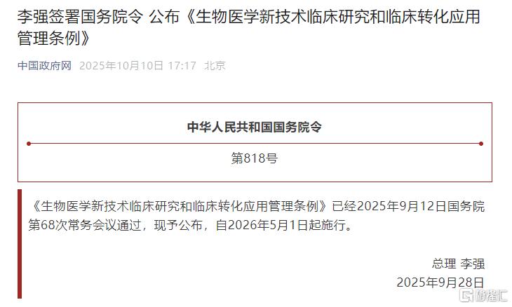 国务院总理李强日前签署国务院令,公布《生物医学新技术临床研究和临床转化应用管理条例》(以下简称《条例》),自2026年5月1日起施行。
