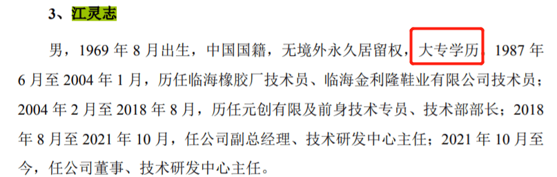 其中,在2023年6月披露的招股书中,江灵志为高中学历,而在上会稿中却成了大专学历。