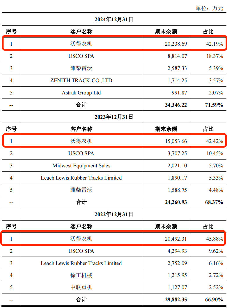 其中,应收账款前五大客户的应收账款占当期应收账款余额比例超过六成。而公司对沃得农机的应收账款余额高达2.05亿元、1.51亿元和2.02亿元,各期占比超40%。