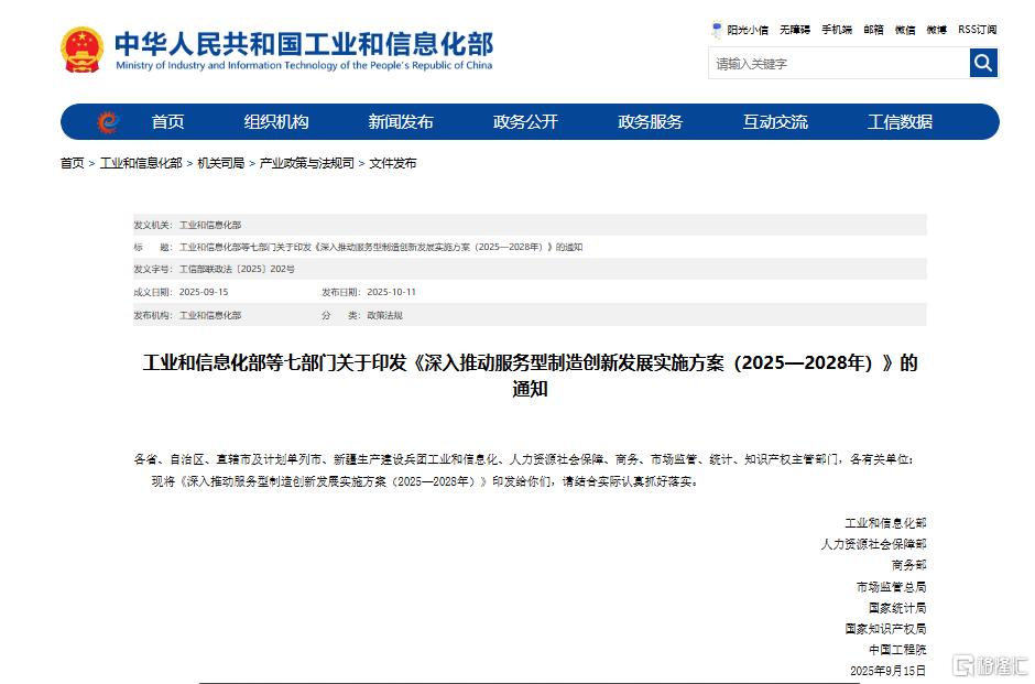 据工信部网站10月11日消息,为贯彻落实《政府工作报告》关于加快发展服务型制造的任务部署,工业和信息化部等七部门近日联合印发《深入推动服务型制造创新发展实施方案(2025—2028年)》,提出到2028年,打造服务型制造升级版,完成20项标准制定,打造50个领军品牌,建设100个创新发展高地,服务型制造典型模式广泛普及、新模式不断涌现,为促进信息化和工业化深度融合、加快建设现代化产业体系提供有力支撑。