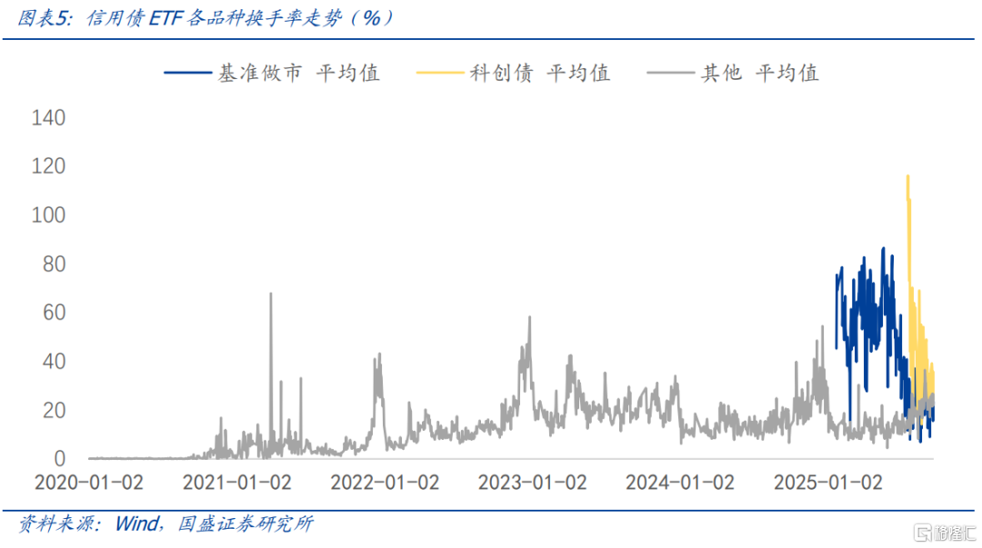 信用债ETF今年在规模增长的背景下流动性也有明显的提升。截止2025年9月19日,基准做市信用债ETF、科创债ETF和其他信用债ETF2025年以来的日均换手率分别为46%、45%和15%。目前均收敛至20%附近。