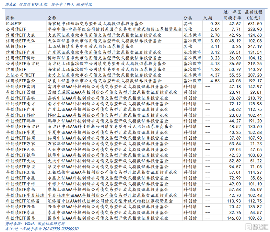 信用债ETF共35只,其中32只为2025年上市,包括8只基准做市信用债ETF和24只科创债ETF,除此之外仅有3只其他类信用债ETF,分别为短融ETF、公司债ETF和城投债ETF,规模最大的为短融ETF,其跟踪的中证短融指数成分券久期均在1年以内,2025年9月30日,规模达631.5亿元,日均换手率在43%,交易活跃度高,能满足大部分交易的需求,是机构场内现金管理的重要工具,也将是短债基金很好的替代品。另外两只债券ETF:城投债ETF和公司债ETF规模也均在200亿以上,但流动性弱于短融ETF,近一年日均换手率为3.26%和7.71%。