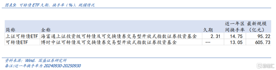 自2020年首只可转债ETF诞生,目前仅有两只转债ETF上市流通,市场规模已突破700亿元。2020年3月6日,我国第一只可转债ETF,即博时中证可转债及可交换债券ETF成立,同年7月13日,第二只可转债ETF海富通上证投资级可转债ETF成立。截止2025年9月30日,博时可转债ETF规模达到605.73亿元,海富通上证投资级可转债ETF规模达到95.22亿元。与场内基金相比,可转债ETF在交易效率与成本上形成碾压式优势,未来将更适合有短期交易与套利需求的投资者。