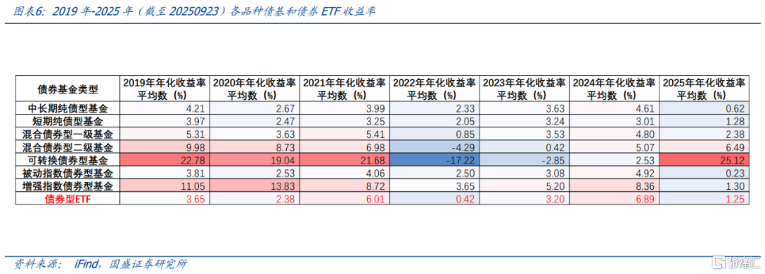 从年化收益率平均值看,债券型ETF表现较为平稳。2023年以来整体表现优于被动指数型基金,与中长期纯债型基金、短期纯债型基金年化平均收益率相差不大。