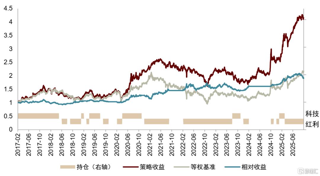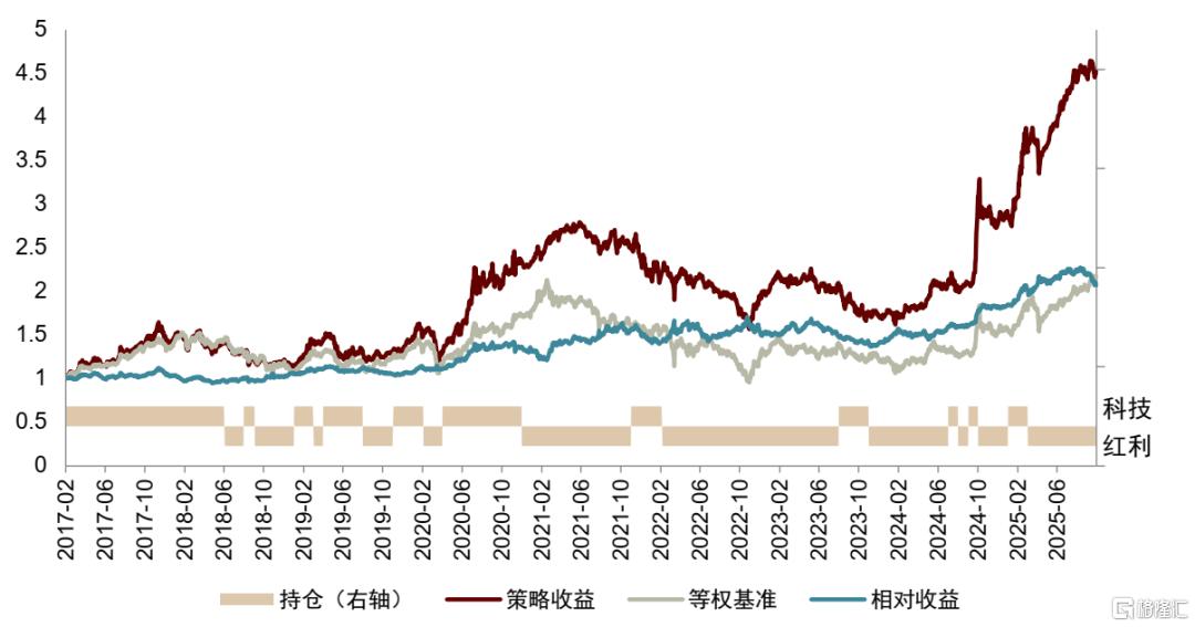 模型的换仓频率在2017至2019年间较为频繁,2020至2024年年中大部分时间均配置红利风格,2024年下半年的几次月度风格切换均带来正向超额收益,2025年1-2月配置科技风格精准捕捉科技板块行情,此后延续配置红利风格。