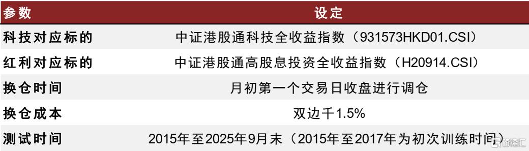 生成风格持仓观点后,科技风格对应持仓标的为中证港股通科技全收益指数(931573HKD01.CSI),红利风格则对应中证港股通高股息投资全收益指数(H20914.CSI)。每月末根据最新因子数据更新观点后,月初第一个交易日收盘进行调仓,换仓成本设置为双边千1.5%。测试时间为2015年至2025年9月末。由于模型滚动训练,每季度根据过去两年训练参数后,对下一季度进行预测,因此最终的预测结果为滚动季度样本外拼接而成。初次训练需要滚动2年生成优选因子以及模型参数,所以实际模型净值起点为2017年。