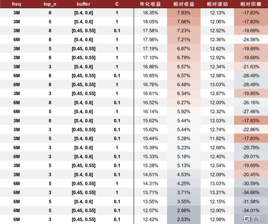 ► 略宽松的因子有效性筛选表现较好(top_n=8)。无论是半年度还是季度训练因子时,top_n个数为8时表现更有优势。这一现象也符合训练逻辑,在低频训练时,筛选更多可能有效的备选因子,从而提高其不同状态下的适用性。