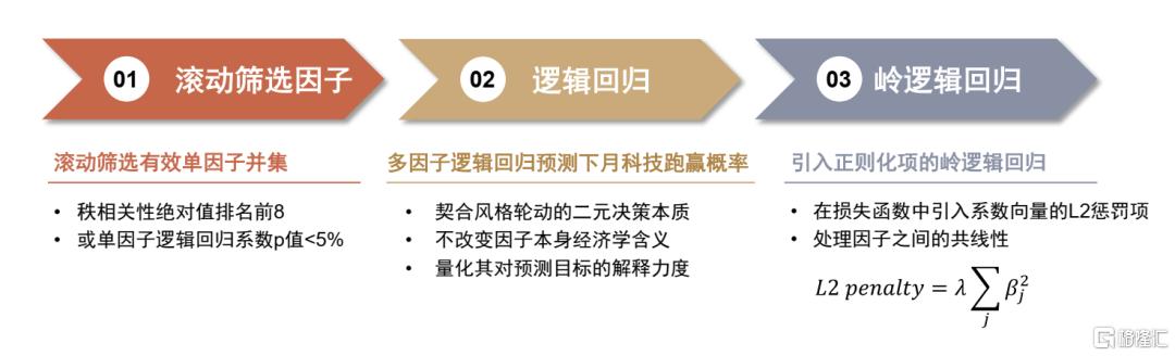 2) 滚动训练的岭逻辑回归:为了尽可能兼顾指标近期有效性和样本外适用性,我们选择滚动选取有效因子组合并训练模型。在模型选取上,考虑到最终的预测目标为下期收益差方向,即下月港股科技风格战胜港股高股息风格的概率,我们选用了逻辑回归模型。此外,由于在筛选因子时仅考虑单因子有效性,并未考虑多因子之间的相关性,因此我们加入正则化处理因子之间的共线性。