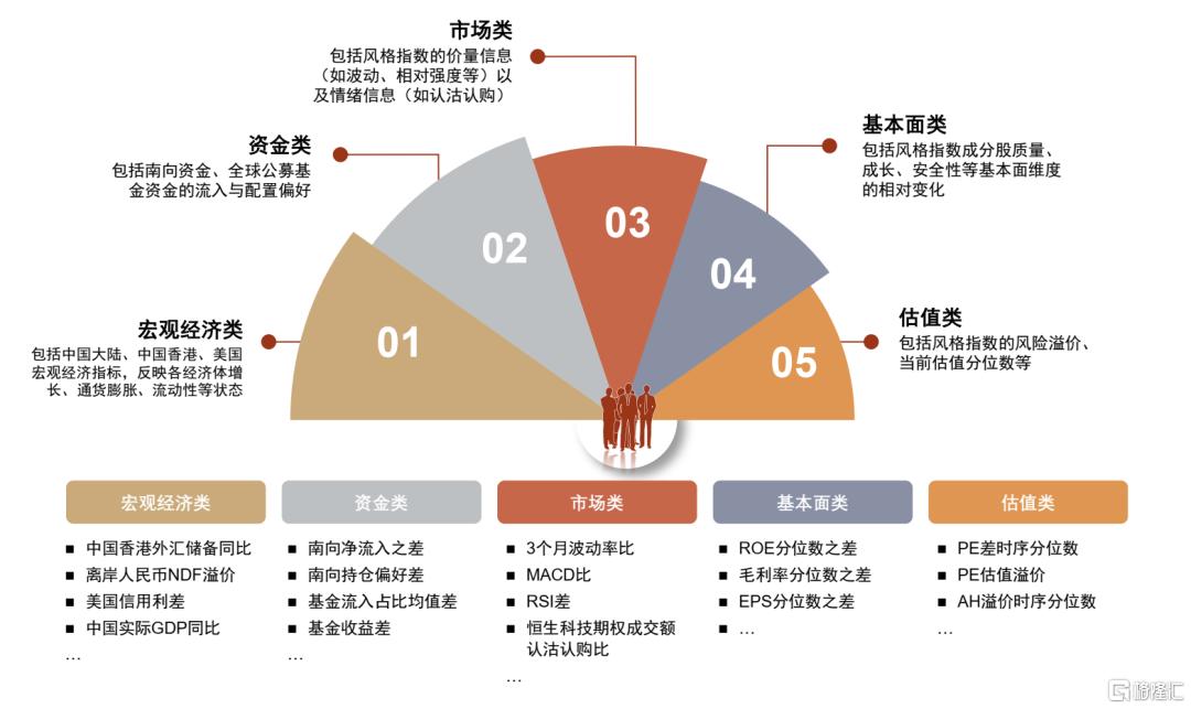我们从五个维度找寻风格轮动背后的影响因素,分别是宏观经济类、资金类、市场类、基本面类和估值类,构建了共101个备选指标。如上文所述,港股风格短期优势呈现月频轮动,且大部分宏观指标均为月度更新,因此我们将所有的指标均统一为月度频率,根据指标含义选择月度平均或取月末最新数据点的方式。