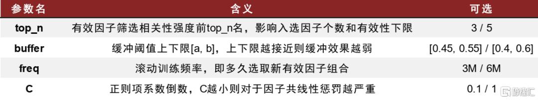 此外,我们也探索了不同参数组合对模型结果的影响。具体测试参数如下表所示。其中,岭逻辑回归的方法通过调节超参数C控制惩罚强度,当因子间存在多重共线性时,减小正则项系数倒数C可有效抑制系数波动,避免因子冗余导致的过拟合;反之当共线性较弱时,增加C可保留信息量。下文以缓冲方法为例展示参数变化的边际影响。