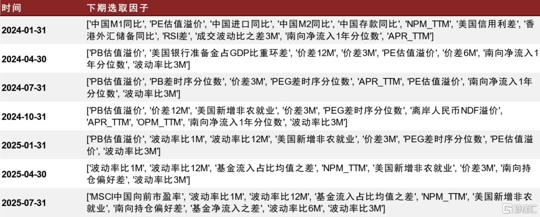 上述的缓冲区间法与简单二分类法仅在预测概率到观点映射方法论上有所不同,而其底层模型参数以及选用因子均保持一致。出于篇幅考虑,下表展示了2024年以来模型滚动选取的因子,例如最新一期2025年7月末的因子即根据2023年7月末到2025年7月末的已有信息挑选因子并训练逻辑模型参数,用于2025年8月到10月末的判断。