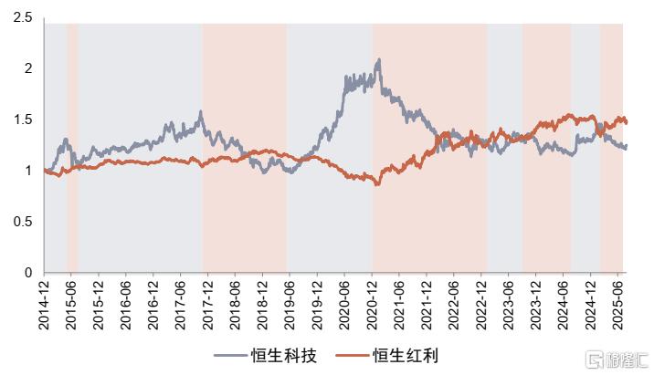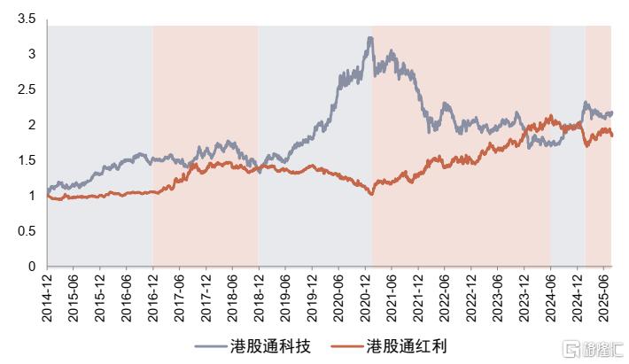 我们分别统计了恒生系以及中证系港股通科技与红利指数的超额收益表现。具体而言,恒生系为恒生科技与高股息率全收益指数相较于恒生综指全收益指数(HSI6.HI)的超额收益,中证系则为中证港股通科技与高股息指数相较于中证港股通综合全收益指数(h20930.CSI)。总结规律如下: