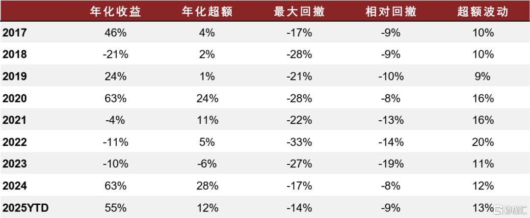 从分年收益来看,除2023年跑输基准外,其他年度均有一定正向超额收益。其中,收益增强最为显著的年份为2020年和2024年,超额超20%,2020年配置科技风格,2024年在长期红利配置中精准捕捉9月科技行情。2021年和2025年至今的超额收益均超10%。