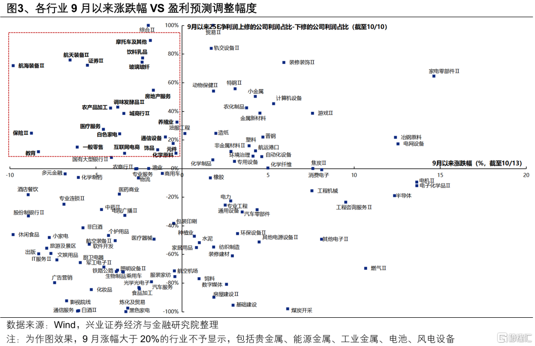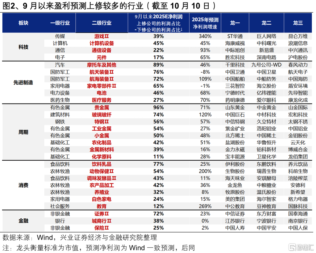 9月以来盈利预期上修较多的行业主要集中在:AI(游戏、计算机设备、通信设备、元件)、先进制造(摩托车、航空航海装备、家电零部件、电池、医疗服务)、周期(有色、玻璃玻纤、钢铁、农化制品等)、消费(饮料乳品、农业、饰品等)、金融(券商保险、城商行)。