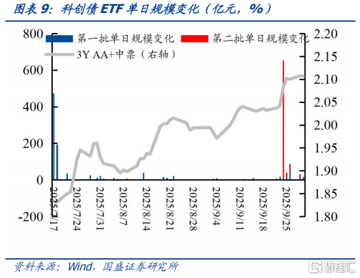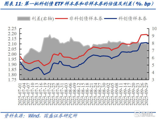 科创债ETF成分券“溢价”维持平稳。虽然7月中旬以来信用债估值持续震荡上行,但科创债ETF样本券的“溢价”相对平稳,比较科创债ETF成分券和同主体相近期限的非成分券,8月中旬以来二者利差基本在8bp左右,9月30日利差在8.08bp。