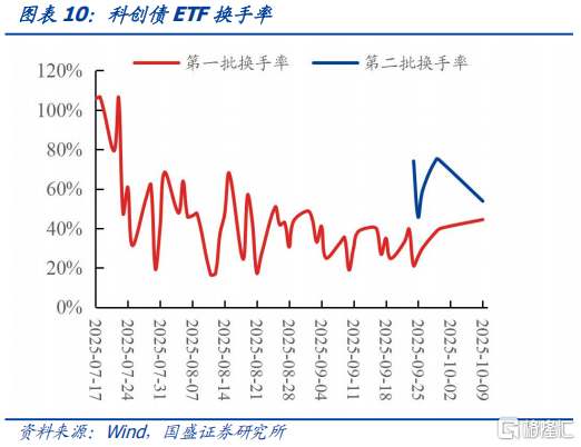 第二批科创债ETF仅上市首日规模增长较多,上市初期换手率略低于第一批科创债ETF。第二批科创债ETF在9月24日上市当天规模有明显增加,此后交易日明显下滑。而从成交活跃度看,第二批科创债ETF上市后换手率较高,日度换手率在45%-75%之间,但略低于第一批科创债ETF上市初期换手率。