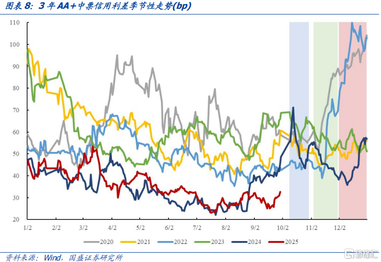从季节性因素来看,10月债市中性震荡,通常12月后下行较为顺畅。从季节性来看,2020-2024年10月债市涨跌不一,2022年、2024年10年国债分别下行11.7bp、0.4bp,2020年、2021年、2023年分别上行3.3bp、9.6bp和1.9bp,2020-2024年平均变化0.5bp,总体呈现中性偏扰动的特征,趋势上往往不明确,整体胜率略低于全年。通常进入12月,债券利率下行趋势较为顺畅。从信用利差来看,10月仍以震荡为主。季节性影响市场参与者预期,但历史并不简单重复,三季度利率持续上行后,叠加市场对四季度基本面定价有预期,若市场情绪修复也存在抢跑的可能性。