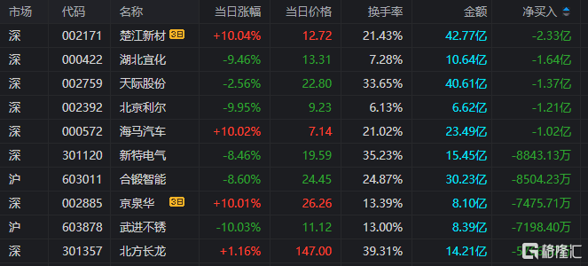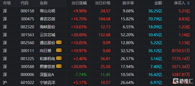 龙虎榜单日净买入额前三为常山北明、香农芯创、海峡股份,分别为5.21亿元、4.83亿元、1.22亿元。