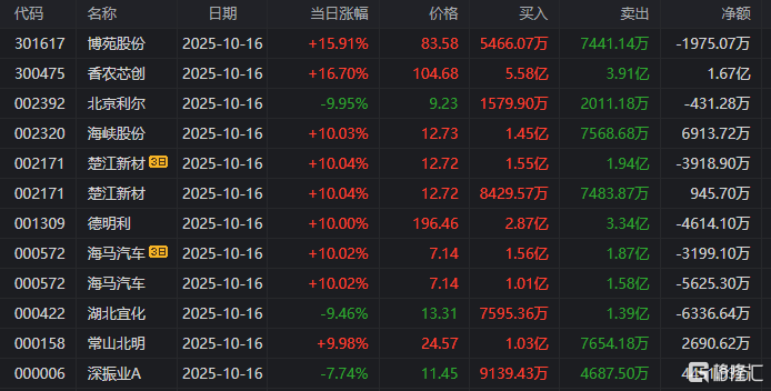 香农芯创:今日涨16.70%,盘中股价刷历史新高,两个月内涨幅已达216%,换手率15.82%,成交额70.79亿。龙虎榜数据显示,机构净卖出6524.23万元,深股通专用席位净买入1.67亿元。