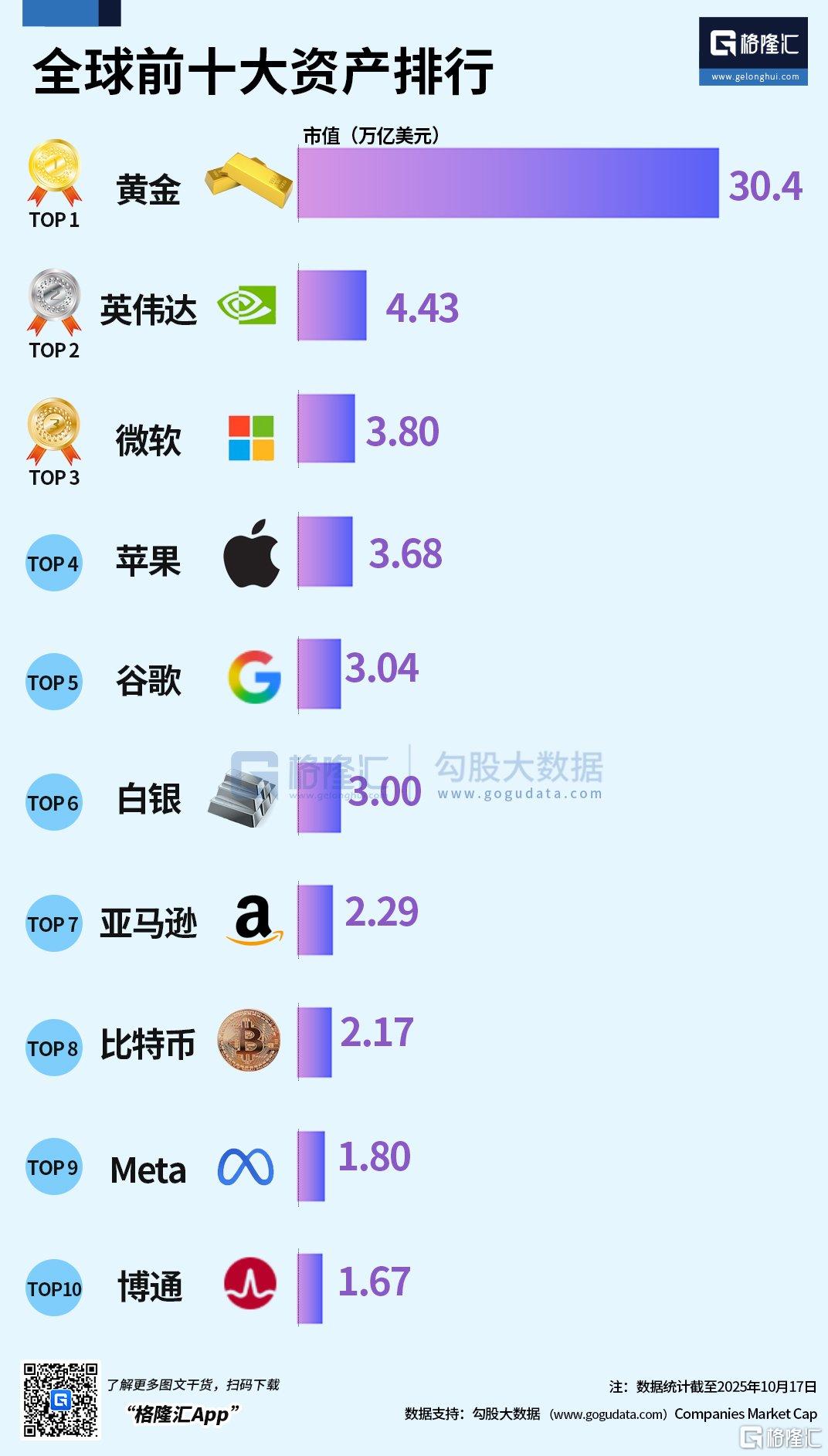 从具体数据上看,若将黄金的总市值与全球巨头企业进行对比,即使将英伟达(4.43万亿美元)、微软(3.8万亿美元)、苹果(3.68万亿美元)、谷歌(3.04万亿美元)、白银3万亿美元)、亚马逊(2.29万亿美元)、比特币(2.17万亿美元)、Meta(1.8万亿美元)、博通(1.67万亿美元)、沙特阿美(1.63万亿美元)的市值加起来,也低于黄金总市值。